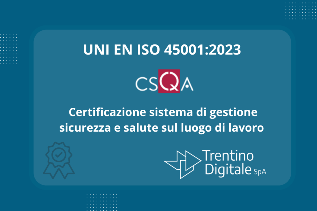 Trentino Digitale ha conseguito negli scorsi giorni la certificazione UNI EN ISO 45001:2023, lo standard internazionale che definisce i requisiti per i sistemi di gestione per la salute e sicurezza sul lavoro (SSL). Il riconoscimento rappresenta un ulteriore passo avanti nella strategia aziendale di miglioramento continuo.