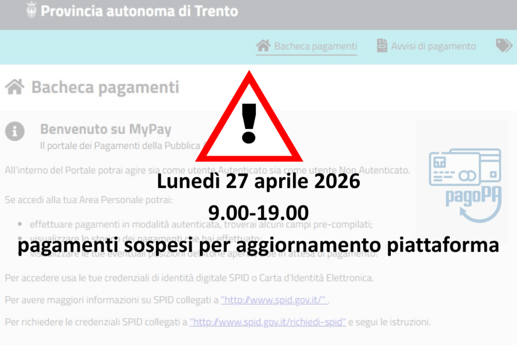 Lunedì 27 aprile 2026 la piattaforma provinciale dei pagamenti elettronici MyPay, gestita da Trentino Digitale per conto della Provincia autonoma di Trento e degli oltre 330 enti pubblici trentini convenzionati, sarà temporaneamente sospesa per attività di aggiornamento. L’operazione rientra nel percorso di evoluzione continua del sistema.