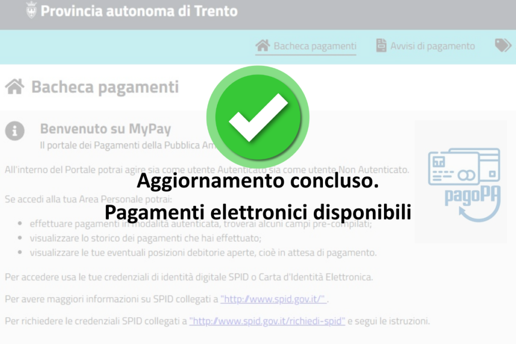 Nel pomeriggio di oggi, lunedì 27 aprile 2026, si sono concluse le attività di aggiornamento della piattaforma provinciale dei pagamenti elettronici MyPay, gestita da Trentino Digitale e utilizzata dalla Provincia autonoma di Trento e da oltre 330 enti pubblici trentini convenzionati.
